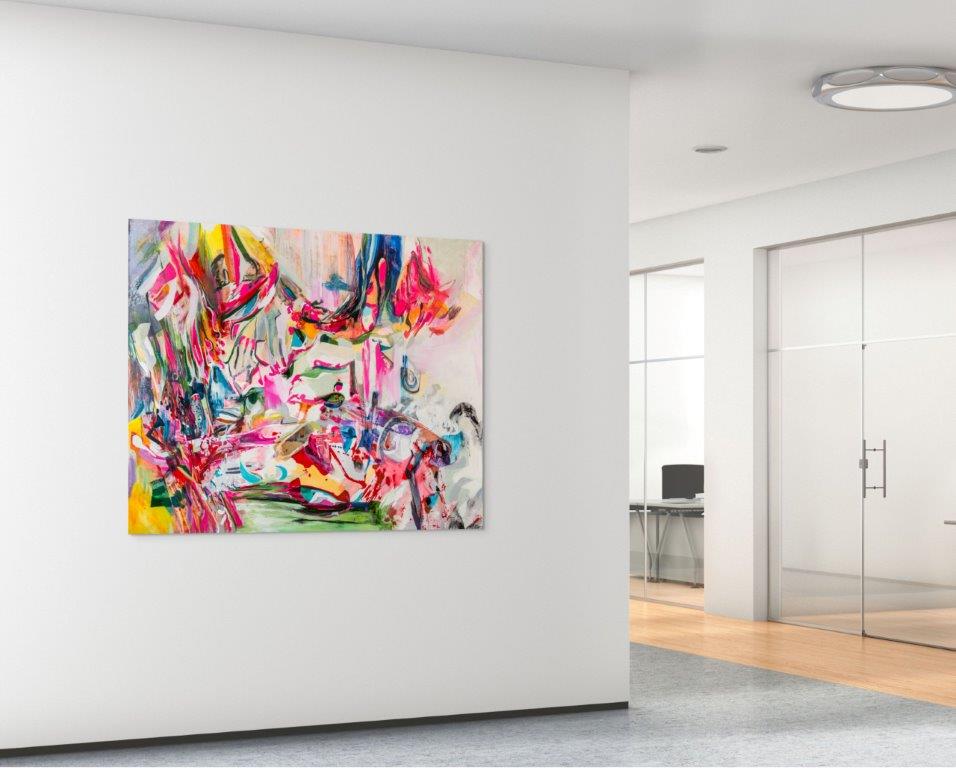 Looking to rent bold, expressive artwork that transforms a space with energy and sophistication? “Symphony” by Vancouver-based artist Chrissy Cheung is a monumental 58 × 74 inch abstract expressionist painting, available for flexible art rental. With vivid colour, gestural lines, and emotional rhythm, this piece is ideal for open-concept offices, creative studios, luxury staging environments, or high-impact production sets.
