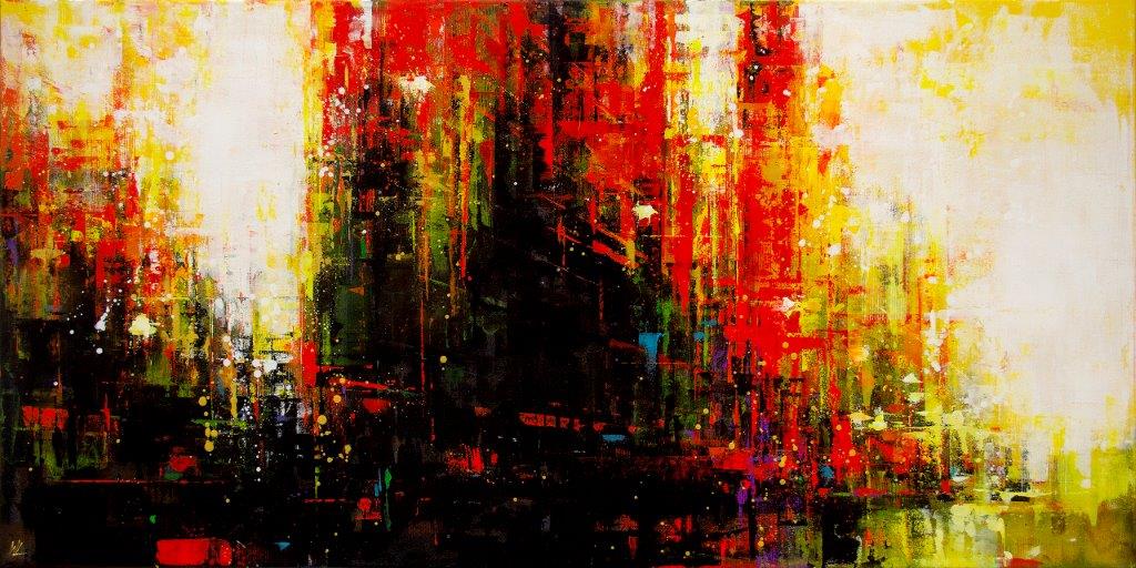 Powerful, radiant, and full of energy — “Urban Adventures: Vitality” is a 30 × 60 inch acrylic painting that captures the beating heart of the city in a rush of reds, yellows, and bold brushstrokes. Created by Vancouver artist William Liao, this piece is available through our vibrant abstract city art rental program.